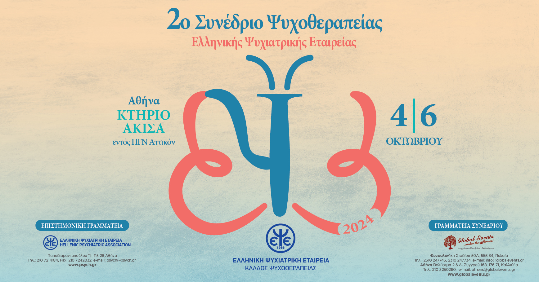 Η Ελληνική Ψυχιατρική Εταιρεία καλωσορίζει το 2ο Συνέδριο Ψυχοθεραπείας που οργανώνει σε συνεργασία με τον Κλάδο Ψυχοθεραπείας. Το συνέδριο διεξάγεται από 4 έως 6 Οκτωβρίου 2024 στο κτήριο ΑΚΙΣΑ της Ιατρικής Σχολής Αθηνών, στο Πανεπιστημιακό Γενικό Νοσοκομείο «Αττικόν».